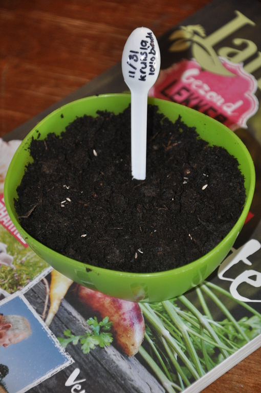 Dus in een groen retro bakje zaaide de boerin vandaag krulsla van Velt.