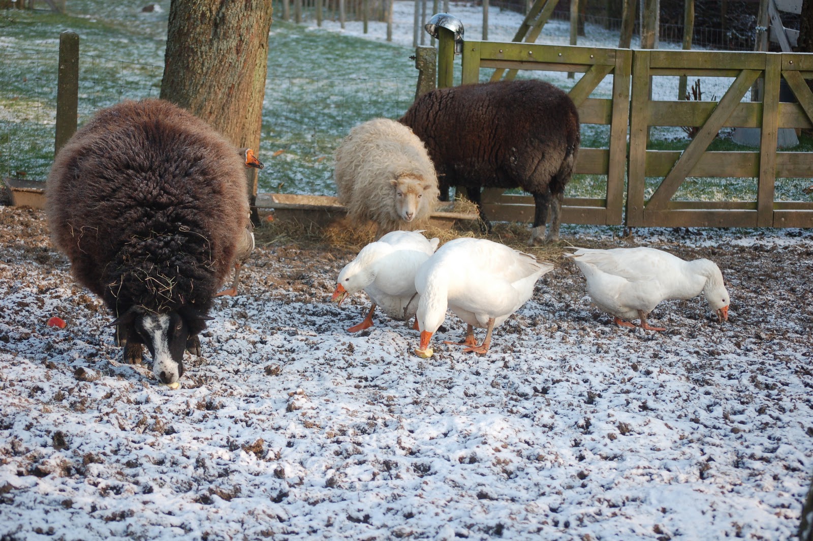 De tijd van het thermo-ondergoed, de mutsen en de wanten is weer aangebroken. Hard werken op de tuinderij. Vooral naast het open hakken van alle waterbakken ook het bijvoeren van de graseters. Want het gras is wit en veranderd in ijs. Dus hier lekker aan de appeltjes en ook hooi en geroosterd brood staat op het menu van de ganzen en schapen. Daarnaast ook nog brok. Wel gezellig hoor het bijvoeren ze eten het liefste uit je hand en alles loopt door elkaar heen. Ik had hulp van Astrid en dat was geen overbodige luxe. Gerrit en Bart zijn klaar met het kort maken van de laurier, nu het wortelstelsel nog….