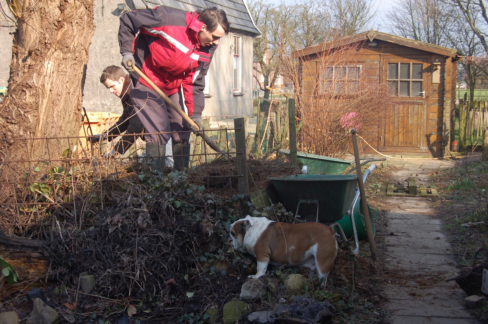 In de voortuin die omgetoverd gaat worden tot drachtplantentuin staat nog een composthoop. We hebben achter ook een composthoop, wat 2 zelfs dus deze mag weg. Extra ruimte voor mooie bloemen. De bovenste helft voeren we af de onderste helft is al prachtige zwarte compost dus die gaan we zeker gebruiken. Bart, Gerrit en ook Bjorn waren hier de ochtend druk mee. Ik ben begonnen met het snoeien van de rozen en samen met Bart en Gerrit hebben we de hortensia’s ook gesnoeid. Het zonnetje erbij gaf het ultieme lentegevoel, heerlijk. Binnen in de kraamkamer staat al heel wat zaaigoed vandaag is daar de hazelnoottomaat bij gekomen. Een wilder soort ter grootte van een hazelnoot (de tomaatjes dan) Spannend hoor!