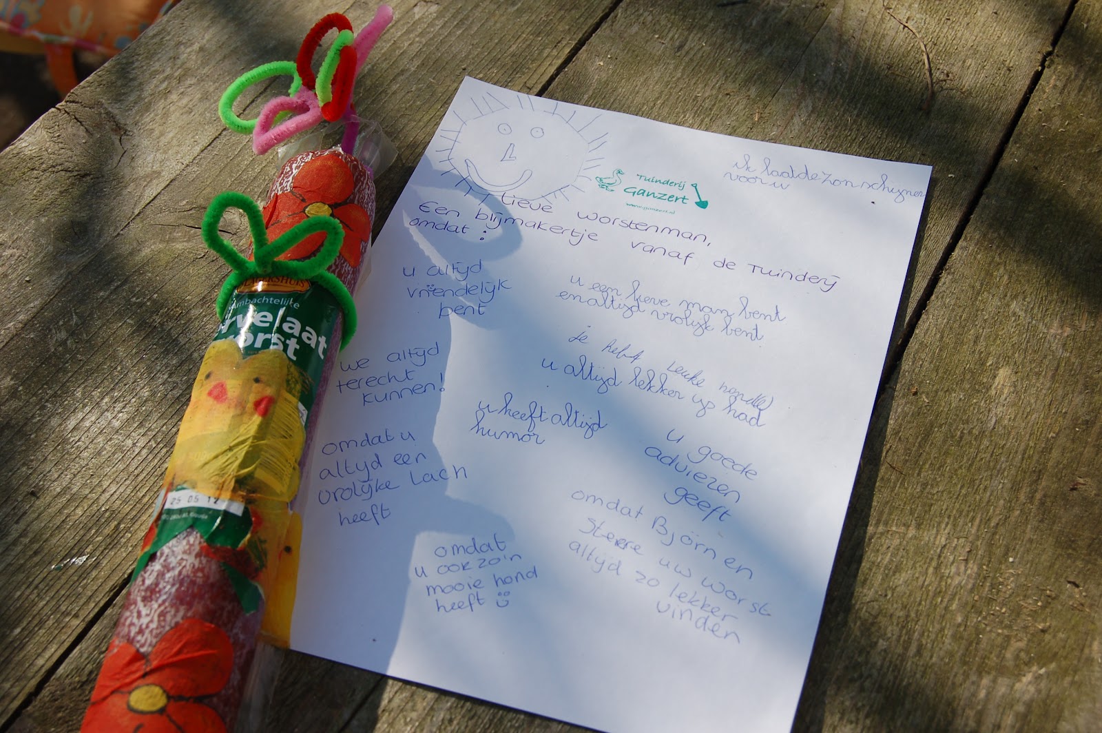 Het is weer woensdag altijd een volle dag op de tuinderij. Vandaag was Bernadette er ook, gezellig. Adrienne en Pieter hebben Bernadette uitgelegd wat blijmakertjes zijn. En zij besloten unaniem dat vandaag de worstenman er 1 verdiende. Wie de worstenman? Ja klopt. Zal even deze bijnaam uitleggen: Bjorn krijgt vers vlees te eten, carnibest. En deze worsten haal ik in Tiel bij Paul Barte. De tuinders vinden het altijd reuze gezellig om mee te gaan want Paul is een vrolijke man vol humor en ijsjes bij mooi weer! Dus om de beurt gaan de tuinders mee om weer een zak worsten te halen. Gelukkig eet Sterre de hond van mijn ouders nu ook carnibest dus moet de vriezer vaker gevuld worden. En vandaag bedachten Pieter, Bernadette en Adrienne om als bijmakertje eens een worst voor de worstenman te kopen en te versieren, mooie brief erbij en aanbieden maar. Jaaaa Paul daar stonden in eens 3 dames en Pieter op de stoep een hele delegatie. Maar ook dit blijmakertje is weer heel goed ontvangen en we hebben een vrolijk moment gehad met elkaar, leuk!