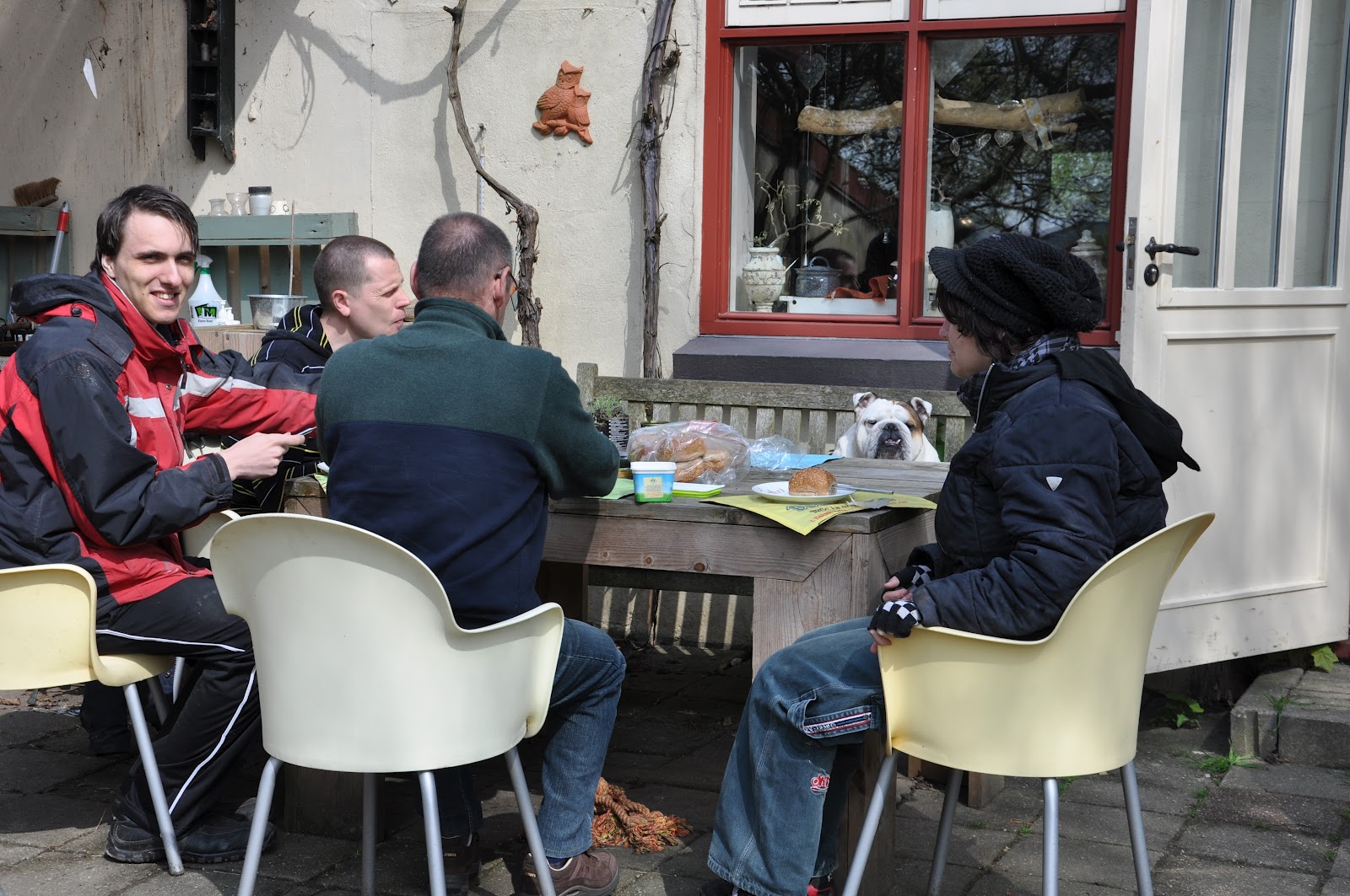 Vanaf een uurtje of 12 kwam de zon tevoorschijn dus na een productieve ochtend lunchen in de zon! Heerlijk dan smaakt de lunch net even lekkerder hè? Bjorn vindt dit altijd geweldig want dan mag hij op de tuinbank erbij. De start met de 1e tuinbank is gemaakt (bestelling) dus weer veel zaag en schuurwerk. Hans is weer helemaal bij met de administratie en zelfs de kweekbakjes hebben nog even in het zonnetje gestaan. Een heerlijk dagje tuinderij dus! En de dames ezel kregen de pedicure op bezoek, Hans de hoefsmid dus zij staan weer mooi op hun hoefjes. De hoefzweer dat wil zeggen de plek van de hoefzweer bij Suus was nog goed zichtbaar en ook nog niet helemaal pijnvrij zo met het mes erbij, brrrr