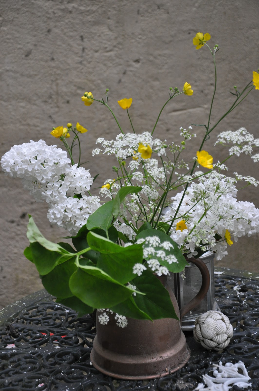 Vandaag wat gezellige bosjes op de tuintafels gezet. Want waarom buiten geen bossen bloemen, ze blijven buiten ook vaak langer mooi. Dit is een echt oerhollands bosje met fluitekruid en boterbloemen en voor een weelderig effect nog wat witte seringen erdoor. In het tijdschrift Landleven zag ik ook een leuk idee om een zinken emmer te vullen oa met Akelei. En Akelei genoeg in de drachtplantentuin dus daar kan ik morgen wel een leuke emmer mee vullen, gezellig voor bij de keukendeur. Feline en ik hebben ook nog stenen gevilt, decoratief maar het heeft ook nog een functie. Wanneer je ze op de verwarming of in mijn geval op de AGA legt houdt de steen heel lang de warmte vast met een wollen jasje dus heerlijk als je koude handen of voeten hebt. In de magnetron kan ook maar dan even nat sproeien.