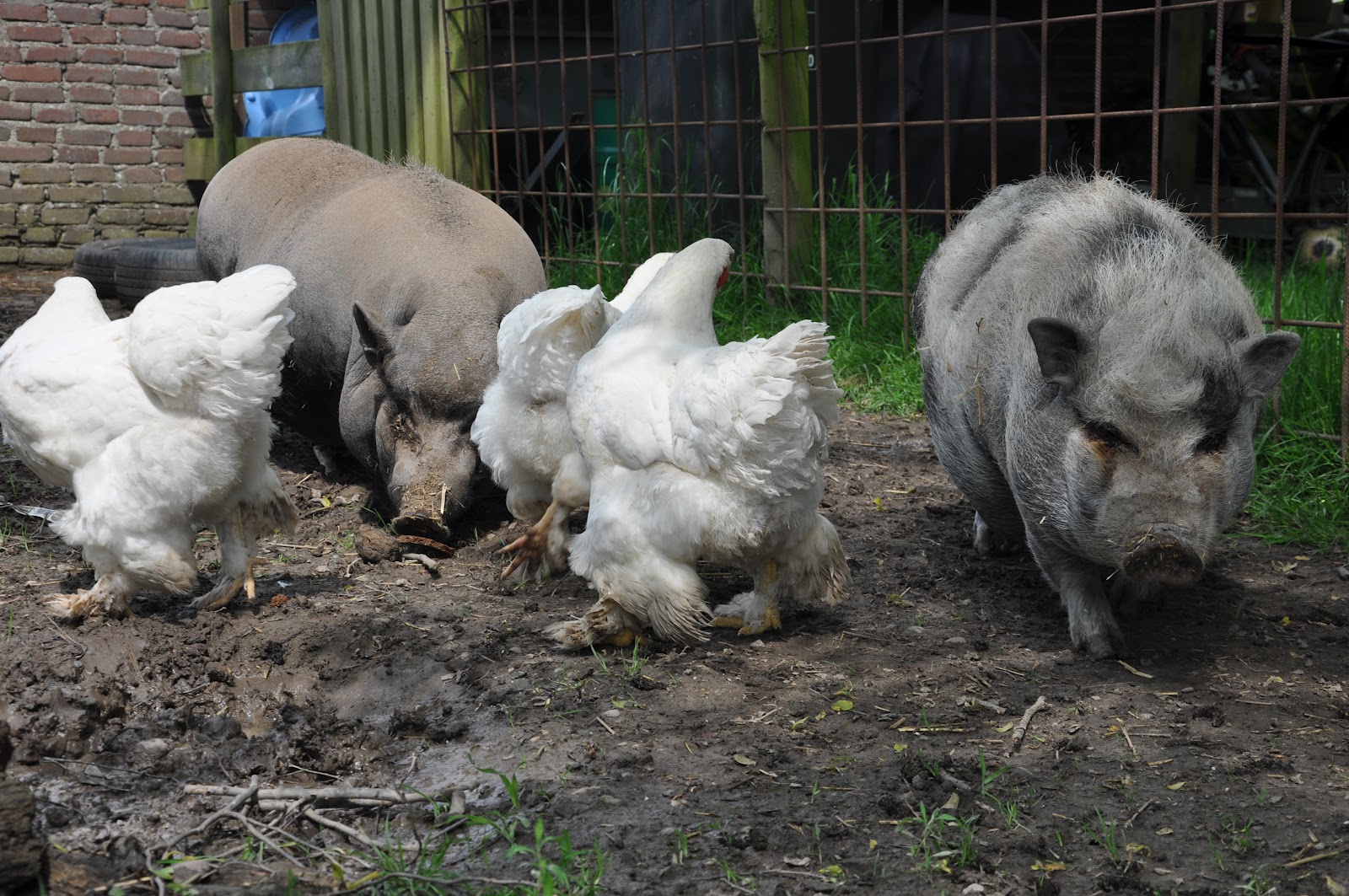 Het is weer modderbadjestijd! En gelukkig heeft de universiteit van Wageningen kunnen aantonen dat varkens en dus ook hangbuikzwijntjes dit echt nodig hebben! Varkens kunnen namelijk niet zweten en hebben net als nijlpaarden water nodig om af te koelen. Ook helpt een modderbad tegen zonnebrand en hebben ze de modder nodig om beestjes van hun huid te verwijderen de zogeheten ectoparasieten. Eigenlijk net zoals kippen dus een stofbad nemen. En met een mooi woord heet het nemen van een modderbad: zoelen! Helaas moeten veel te veel varkens in nederland het doen met beton en gaas….Maar Emma en Bregje kunnen hier naar hartelust zoelen en dat doen ze dus ook en de 4 witte dames drinken heerlijk uit het modderbad.