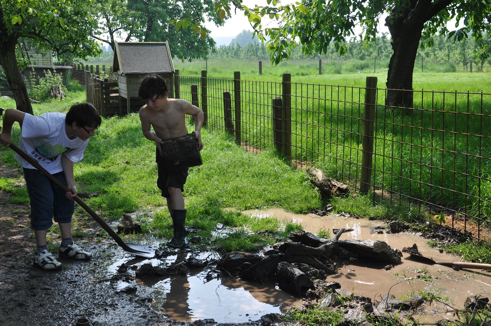 De modderpoel van de dames Knor heeft vandaag ook nog een dam gekregen (hmfff Bregje was het daar niet zo mee eens dus de dam is al in de poel gekiept) Lekker kliederen met water en modder, heerlijk toch! Vanmorgen hebben Bart en Joey een opdracht afgerond en zijn ze gestart met een bank met klep. Weer een nieuwe uitdaging, wederom een bestelling. Verder natuurlijk watergevechten, ijsjes en als lunch poffertjes,,,,,,heel vervelend!