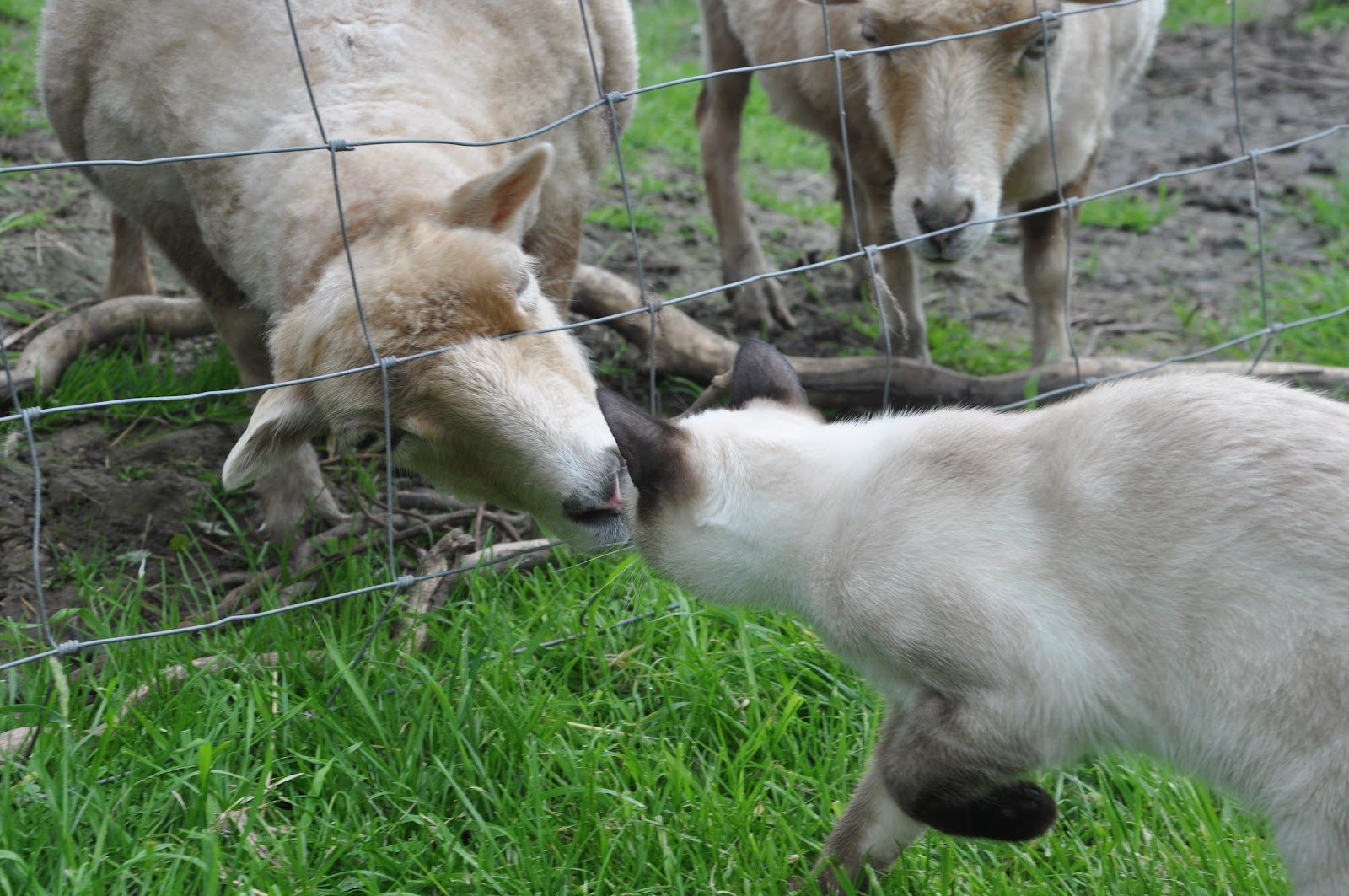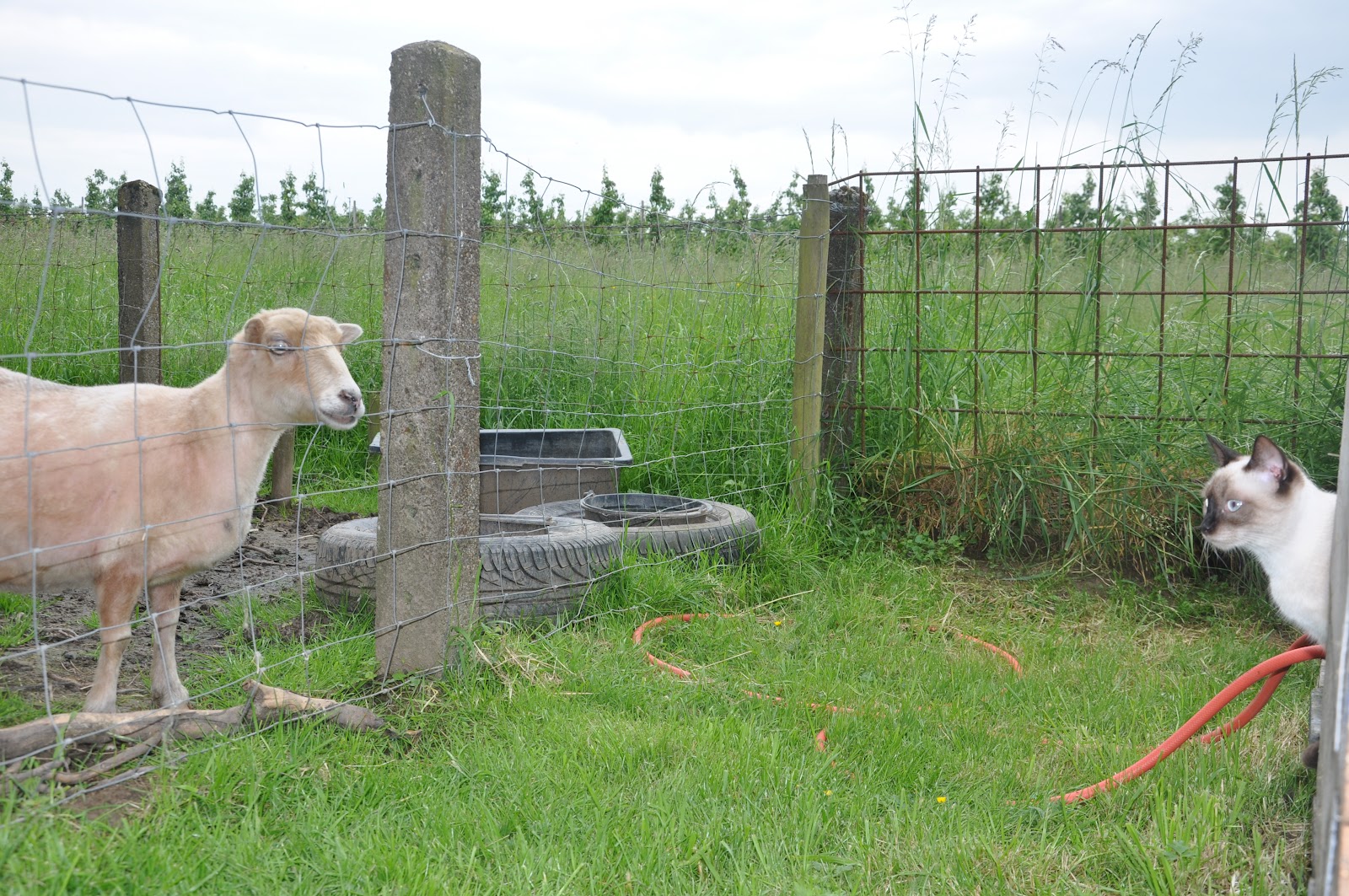 Vanmorgen liep ik met de Frits de camera naar de boomgaard om de kersen erop te zetten. Pip liep mee en zo kon ik dit prachtige tafereeltje vastleggen. Nina vindt Pip wel leuk en komt echt naar het hek om contact te maken. Pip kijkt eerst even hoe of wat en dan…..
