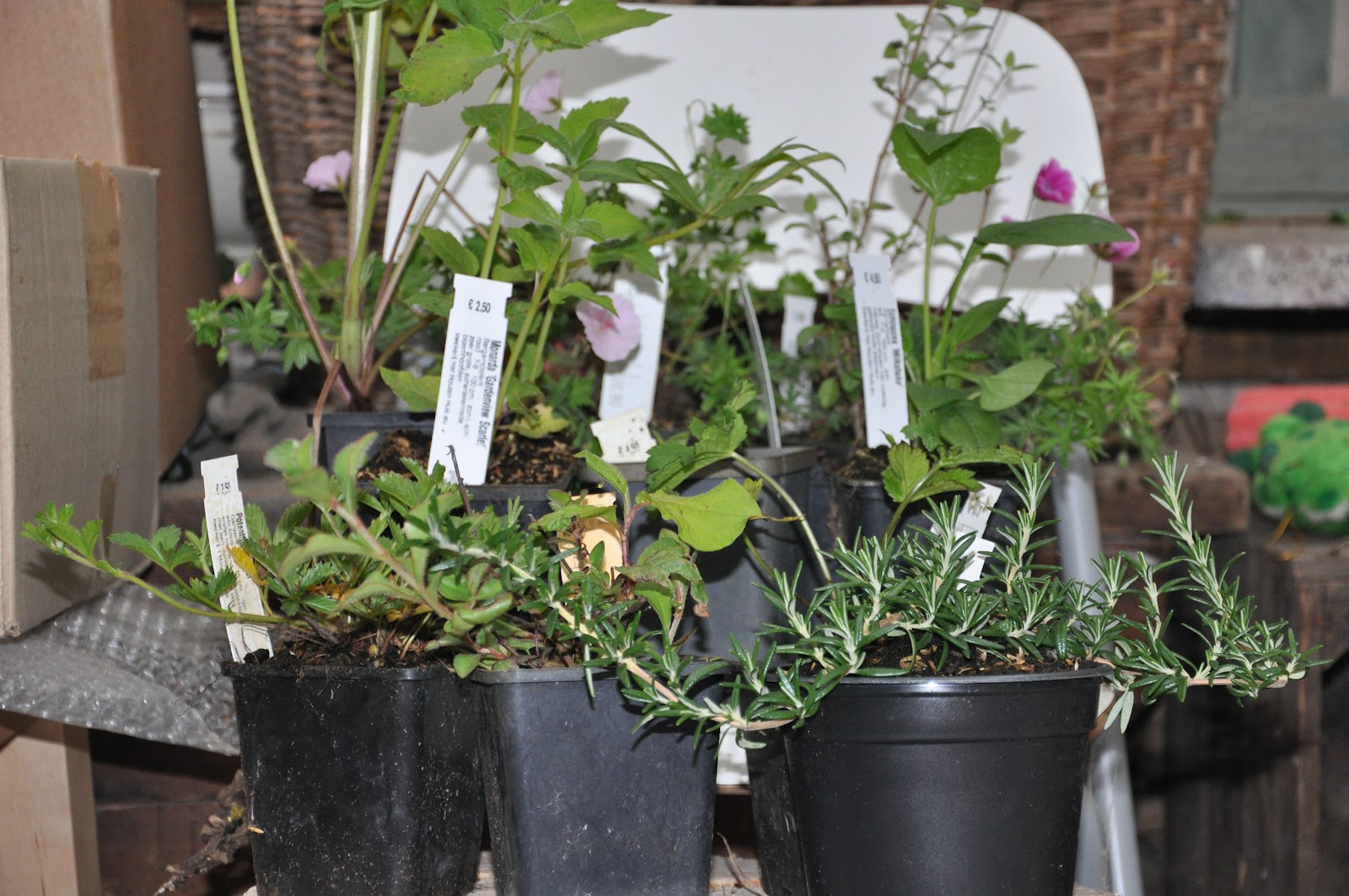 Vanmiddag met 2 geweldige meiden naar mijn lievelings kwekerij geweest. Het Houten Huis in Zaltbommel. Echt wat een pracht aan mooie platen, heerlijke sfeer en echt mensen die er verstand van hebben. En….ik heb mijn enthousiasme over kunnen brengen. We hebben bij elkaar heel wat gekocht. Dit is mijn buit, op de hangrozemarijn na ga ik morgen alles in de drachtplantentuin zetten. Kan niet wachten tot alles in de bloei komt. Zelfs een zeeuws knoopje gekocht, bergamot, ooievaarsbekjes, loodkruid, ganzerik, oeranje papaver en een mooie kleur lupine oja en nog een witte zonnehoed.