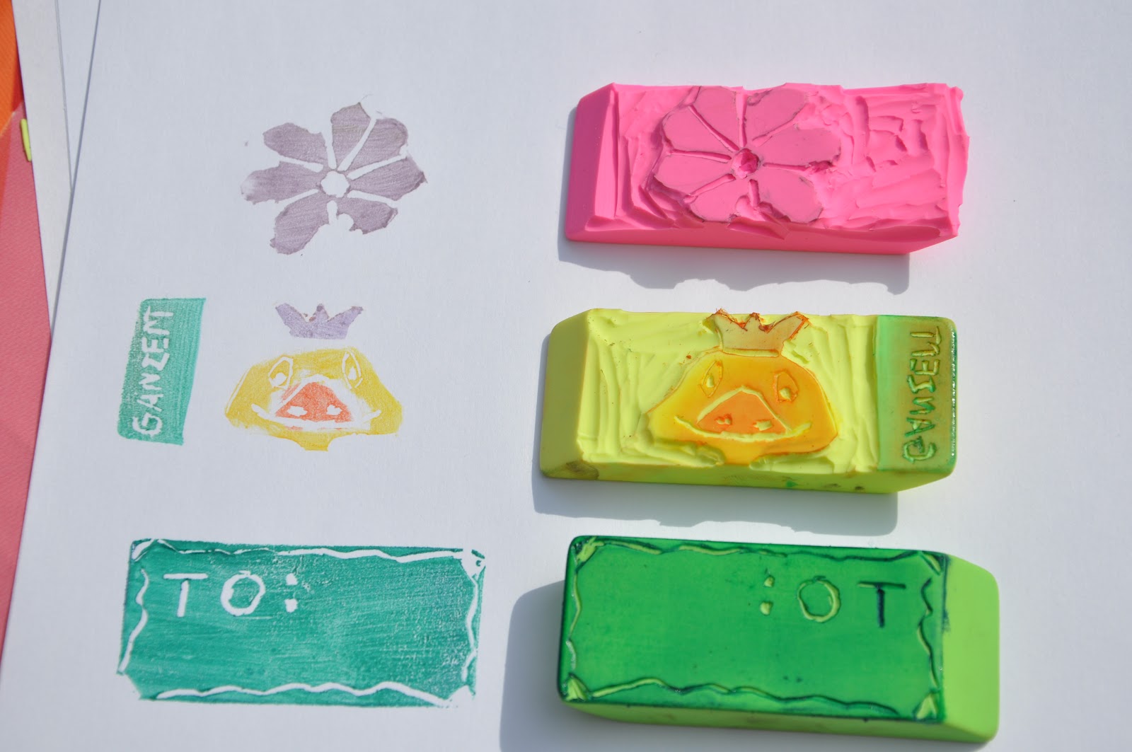Collega Clarissa en ik houden eens in de zoveel tijd een freubelmiddag. Vanmddag stond er sinds lange tijd weer 1 gepland. En dit keer hebben we stempels gemaakt van gum. Had er al 2 gekregen, er staat er nog 1 in de bestelling maar zelf maken is natuurlijk het allerleukste! Dit zijn mijn 1e home made stempels en ik ben helemaal niet ontevreden. En beter nog het is erg leuk om te doen! Je hebt alleen gummen nodig, kleine gutsjes en stempelinkt en oja een goed potlood om de afbeelding eerst op het gum te zetten.