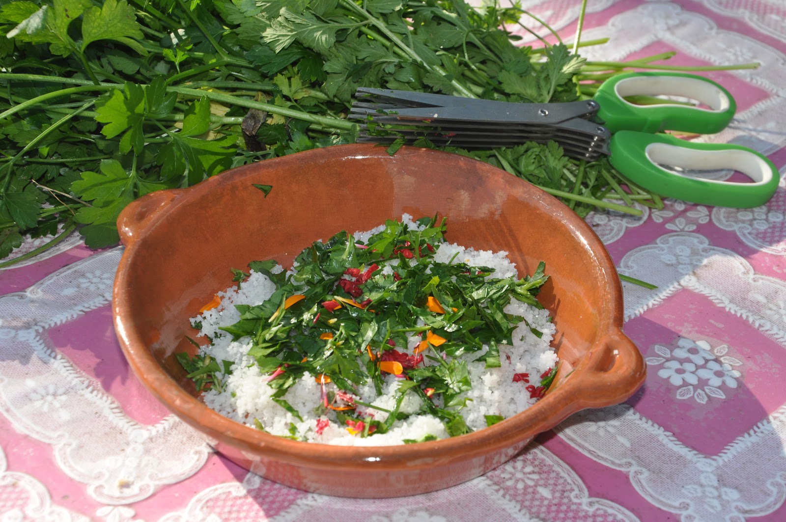 Zelf heb ik peterselie en rozemarijn gebruikt met wat bloemblaadjes van de goudsbloem en de bergamot (geeft het zout straks een leuk kleurtje) Knip de kruiden fijn met een kruidenschaar, heb je deze niet dan heel fijn snijden. Voeg net iets meer grove zeezout toe dan de kruiden. Roer alles goed door elkaar en doe het in een schone pot. Laat dit minstens een week staan.