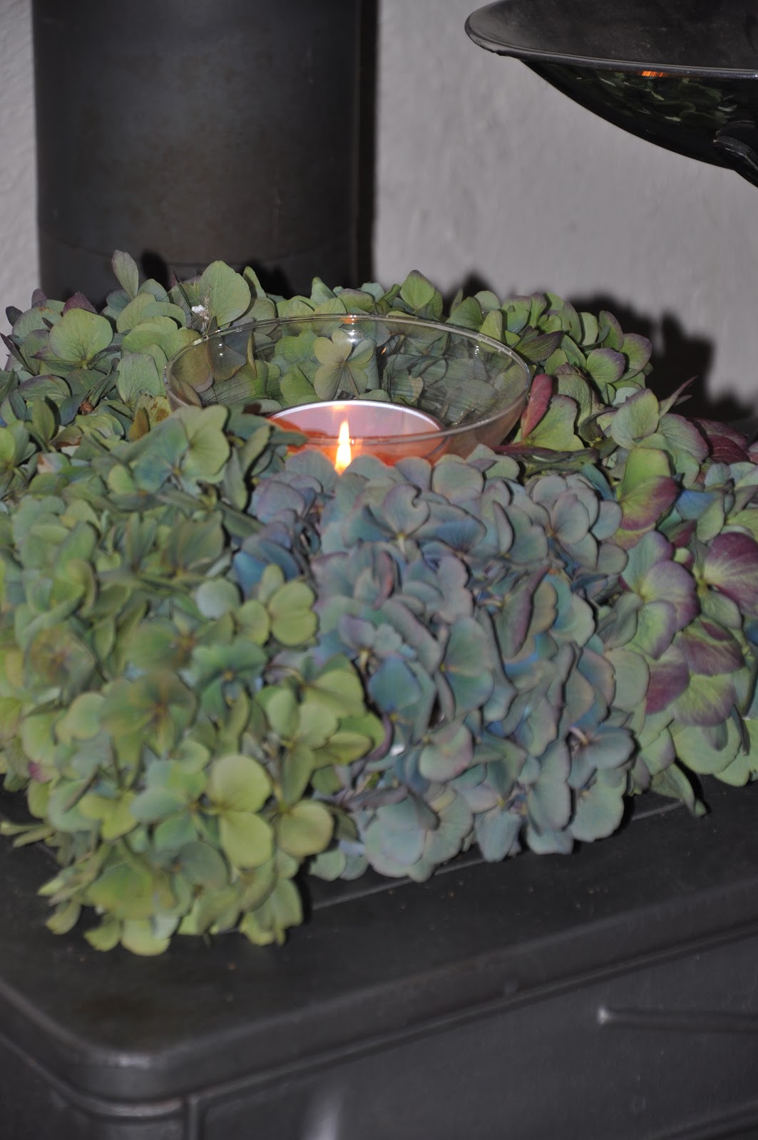 De wintertijd is ingegaan. Vanmorgen was het ook gelijk winters-wit van de vorst, brrrr. Waterbakken van de dieren bevroren en het gras was wit ipv groen. Altijd weer even schakelen en wennen. Wat mooie bloemen van de hortensia geknipt en in een ring van piepschuim gestoken. Vaasje in het hart gezet met een kaars erin, simpel maar sfeervol nu het zo snel donker is…