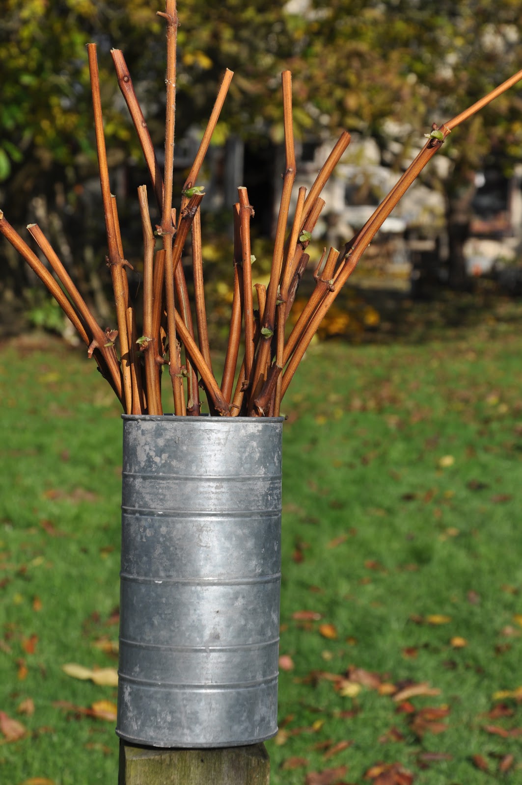 Ik heb de druif ook haar wintersnoei gegeven en de mooie rechte stukken in een blik gezet. Dit worden de planten-steunen voor de zaailingen die in het voorjaar weer een steuntje kunnen gebruiken. Geeft net een wat natuurlijkere look en kost niks.