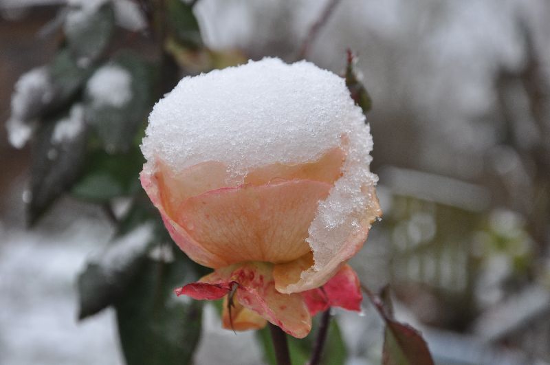 En toen…..lag er zo maar in eens sneeuw. Gelukkig een hele boel mensen blij. Ik niet ik hou helemaal niet van sneeuw. Alleen de sneeuw foto’s die zijn dan nog een beetje aangenaam. Zoals deze dappere roos die ineens een sneeuwmuts op haar kelk had.