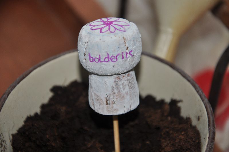 Je kunt kant en klare planten-labels kopen om bij je zaailingen te zetten. Maar ik ben een groot voorstander van hergebruik. Vorig jaar gebruikte ik bijvoorbeeld ijsstokjes. Ook heb ik wel eens oude luxaflex in stukken geknipt. Maar vandaag leek me een kurk wel grappig. Dus wat kurken wit geschilderd, schrijft net wat makkelijker. Naam erop en op de achterkant de latijnse naam. Saté-prikker erin steken en bij je zaailingen zetten.