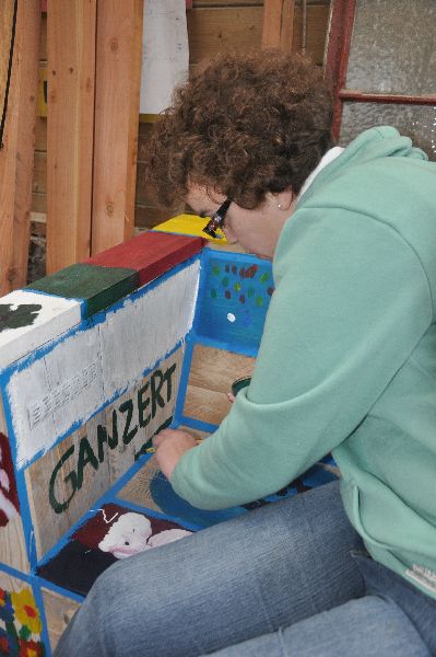 De vakantie is voorbij en wat heeft een ieder weer een energie, heerlijk! De Allemanswaardbank staat weer op de Tuinderij. Wij hadden zelf nog de schone taak om wat vakjes in te schilderen en er staan nog 3 vakken over voor de apotheek. En als dze vakken allemaal kleurrijk zijn dan gaan we de bank aflakken en kan de bank tijdelijk verhuizen naar de woningbouwvereniging. Wat een eye-catcher wordt het zeg, geweldig. Dat wordt weer een moeilijke om afstand van te nemen. Annemarie is hier bezig met het vak voor de tuinderij. Bart is weer volop bezig geweest met onze visitekaarten van schijfjes hout. En zo kon ik verder met het leegruimen van de buitenkamer die nu omgetoverd gaat worden tot gezellige werkkamer/atelier.