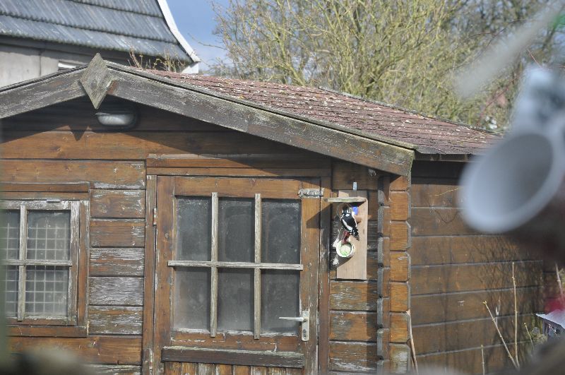 Klik maar op de foto en kijk dan eens bij het kippenpaleis, rechts. Bij de mac pinda. Hoog bezoek……..want de bonte specht bezoekt de mac!