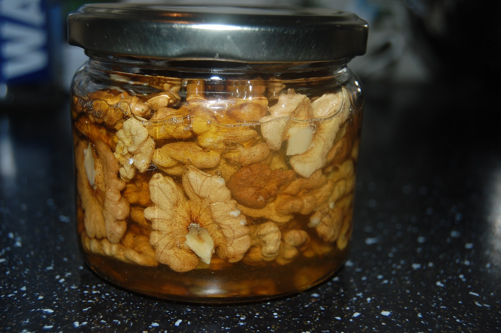 Vanmorgen werd onze verwarmingsketel gemaakt dus kon geen kant op. De beste man liet steeds de deuren open staan dus ik ze weer dicht doen ivm ontsnappingsgevaar van de poezendames. Maar niks doen kan ik niet dus ben ik maar walnoten op honing gaan zetten. Op een hele lage temperatuur honing verwarmen, lees vloeibaar maken, walnoten in een glazen pot doen en overgieten met de honing tot ze onderstaan. Voor de smaak wat gedroogde tym erover….. Heerlijk bij roomijs in de griekse yoghurt of de bodem van een appeltaart mee te beleggen. Altijd handig om van deze potten op voorraad te hebben. Vanmiddag kwam Bernadette dus kregen de poezen een uitgebreide knuffelbeurt en hebben we hand en span-diensten bij de Landwinkel verricht.