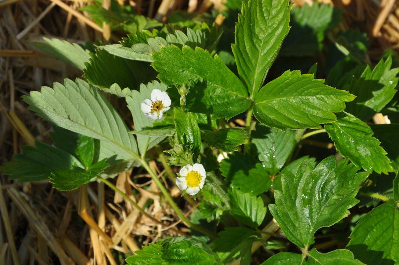 De aardbeien stonden dus niet te vroeg boven het stro want ze zitten vol bloemen!