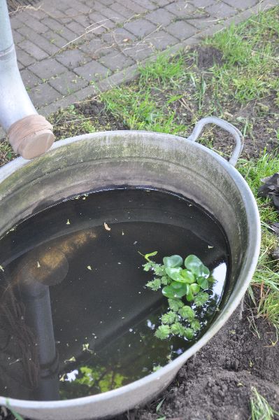 Regentonnen hebben we ook maar ook regenteilen. Bij de stal. En van de week kreeg ik een briljante tip van de vader van mijn wandelvriendin. Een panty aan het uiteinde van de regenpijp dan blijft het water mooi schoon. Geen rotte bladeren uit de goot die mee glijden….Had alleen geen mooi panty-sokje dus er komt een hippere versie op. Wel wekelijks even het blad en de pruttel voor het kousje verversen.