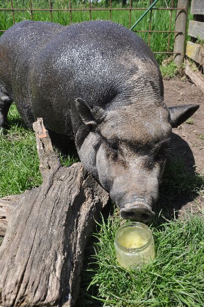 Ik maakte eerder al zalf van goudsbloemolie en vandaag gaf ik Emma het hangbuikzwijn daar een huidmassage mee. Heerlijk vindt ze dit! Emma heeft een hele droge huid en voor het warme weer echt gaat beginnen, smeer ik haar altijd helemaal in. Er ging dus ook een pot doorheen. Zo blijft haar huid soepel onder de grote modderlaag straks van de zomer. En na de zomer en de warme herfstdagen was ik alle modder er weer af (beschermlaag voor muggen en vliegen) en krijgt ze weer een massage met olie/zalf.