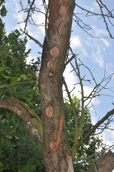 Deze oude pruimenboom is dood. We hebben m laten staan omdat de ezelmeiden er altijd zo lekker langs schuren. En wat zag ik vandaag?? Ook de bonte specht heeft er plezier van, prachtige ronde gaten zijn er in geboord!