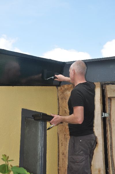 Het muurtje hadden we al korengeel gemaakt en nu dus de boeiboorden antiek-groen. Wij vinden het zelf een geweldige combi!