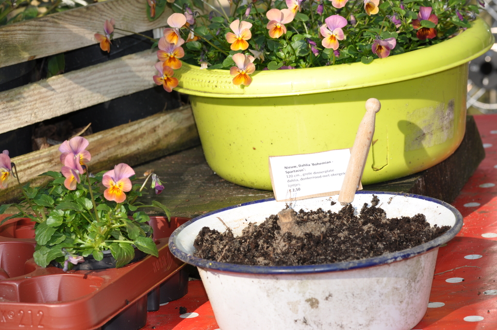 Om er alvast in te komen deed de boerin alvast een Dahliaknol in een oud drinkbakje van de kippen. Die mag binnen vast voortrekken…