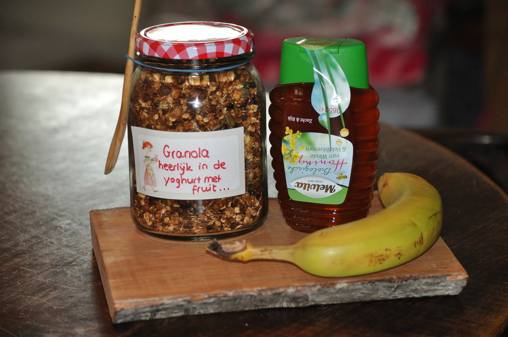 Dus maakte de boerin vandaag een hele plaat granola voor in een lekkere kom boeren yoghurt, vers fruit erin en een scheutje bio honing, haaaaa