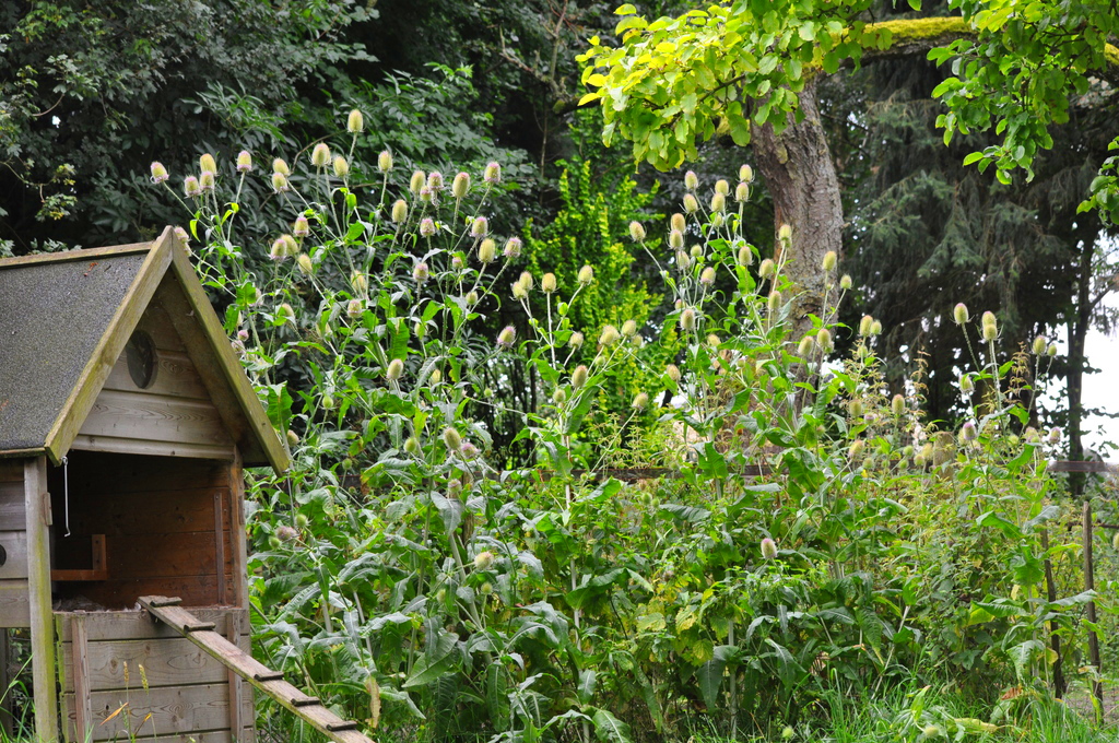 Afgelopen najaar zette de boerin wat zaailingen van de Kaardenbol langs het hek bij de kippenvilla.