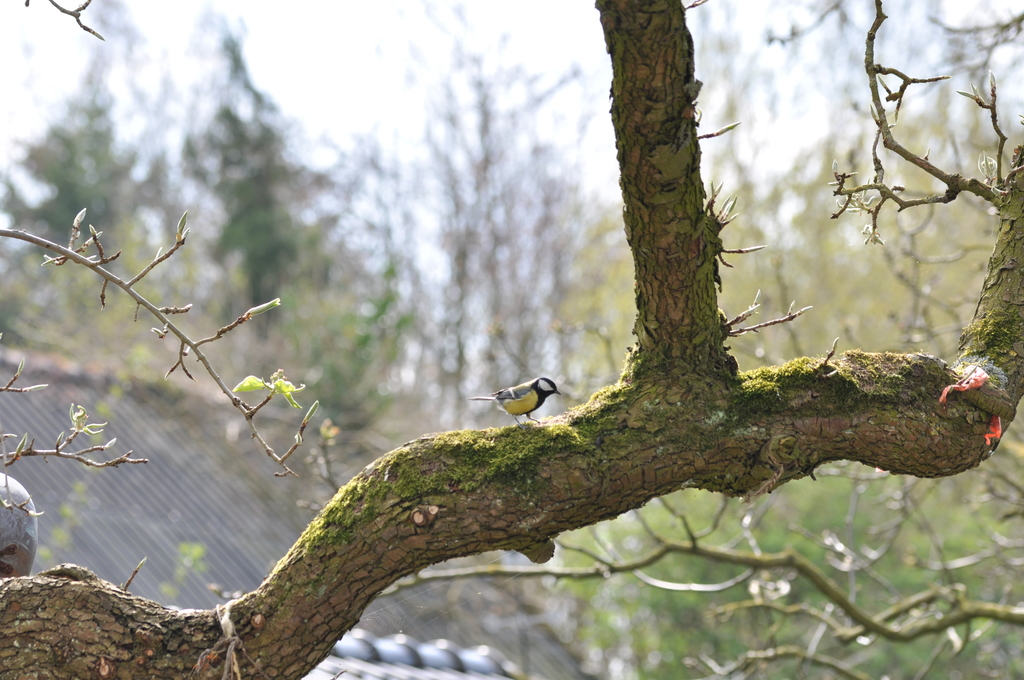 Dit koolmeesje trekt het mos van de oudste perenboom, wat zullen die baby meesjes straks lekker zacht liggen..