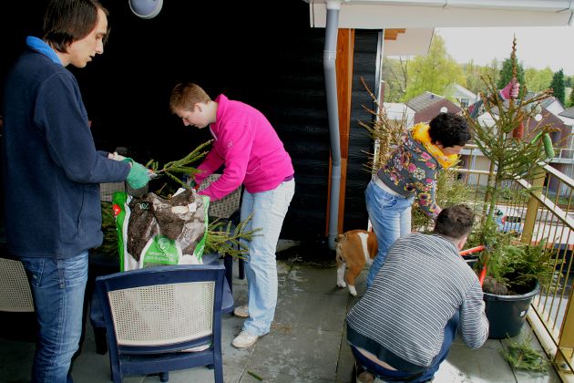 We hadden de hoop om de 2 kerstbomen over te kunnen houden op het terras. Maar de kluit was echt te klein en de kerstbomen werden steeds zieliger en verloren duizenden misschien wel miljoenen naalden.