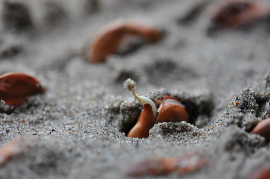 Kijk ze gaan goed de Tuinbonen in de bak zand.