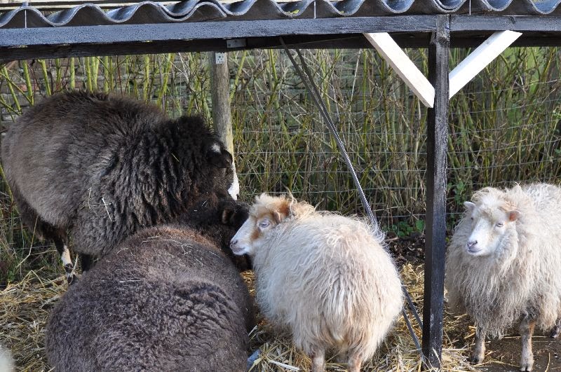 De schapendames zijn helemaal blij met hun nieuwe onderkomen, ook Lars en Rose de ganzen duiken er regelmatig even onder. Een gezellige bedoeling en dat allemaal in de ezeltuin.
