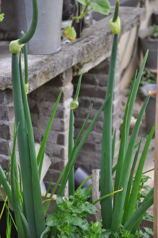 Het bolletje bovenop het frisse groen daar komen straks allemaal kleine uitjes in. Die kun je eten.