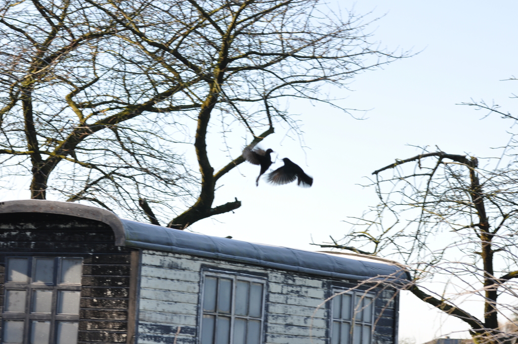Als je op de foto klikt dan zie je het nog beter, boven het dak van Mamaloetje een gevecht in de lucht.