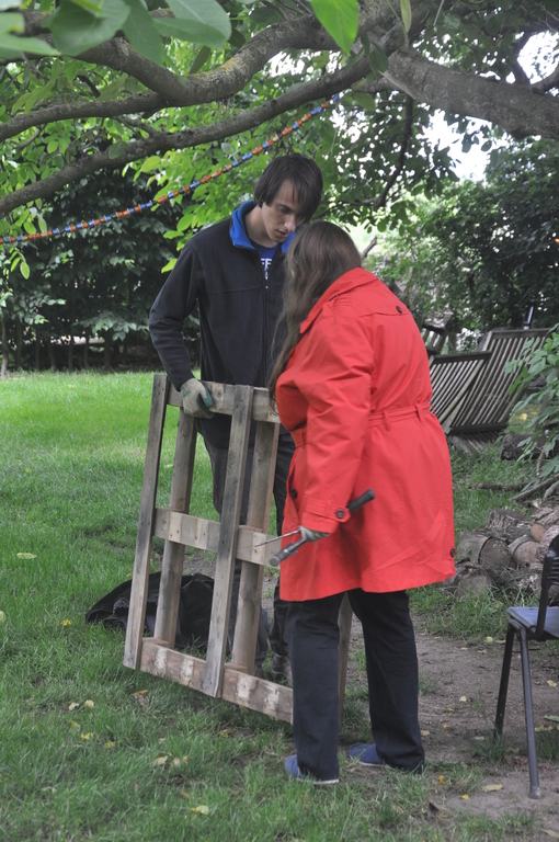 Trisha helpt Bart met het vakkundig uit elkaar halen van een pallet.
