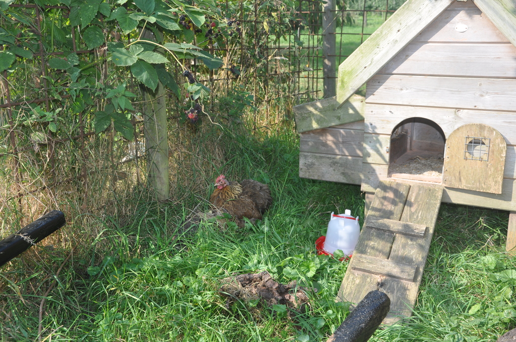 Dus heeft de boerin haar villa naast de grond van de dames Knor en de villa van Zomer en Herfst (2 kippendames) geplaatst.